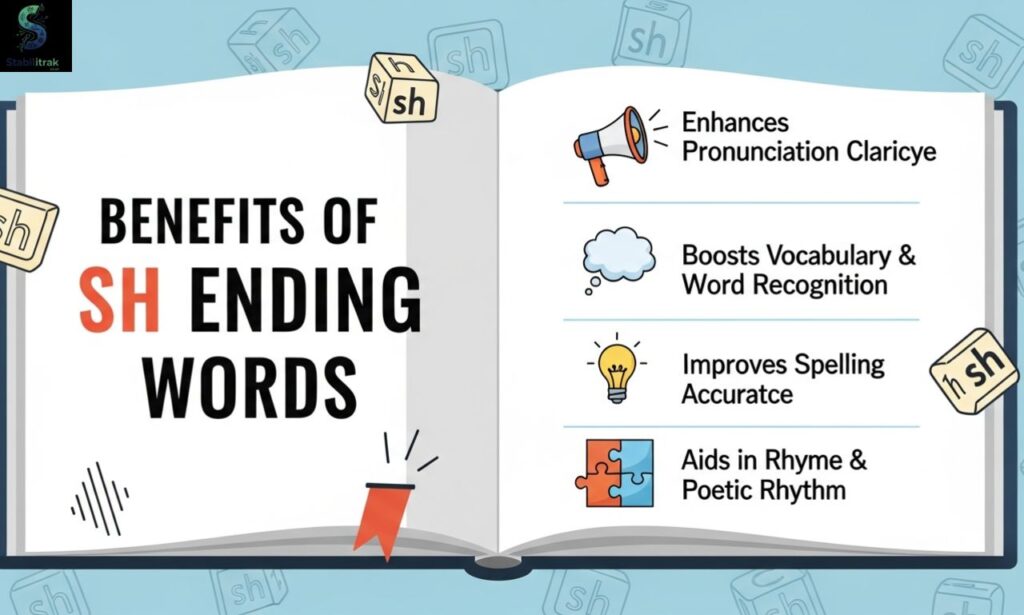 Sh ending words help improve pronunciation, vocabulary, reading fluency, and writing skills in English.